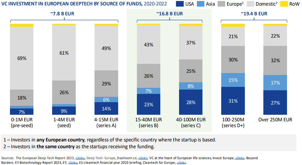 The report by Enrico Letta, published in April 2024, followed by Mario Draghi’s report, extensively discussed the challenges and hurdles that the EU faces in scaling up innovations within the EU single market. Actions are required to support the growth of startups and scaleups, which are key to innovation in Europe. Particularly for deep-tech companies, several reports (see caption in the figure below) have shown that scale-up funds are heavily reliant on overseas investors, bringing a high risk of companies relocating.