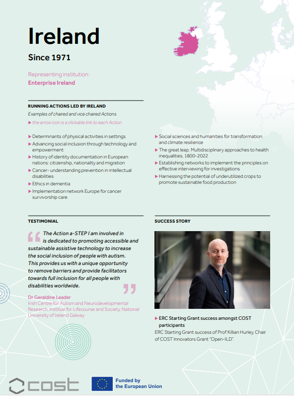 Exploring Current Actions: The factsheet provides links to ongoing COST Actions led by Ireland’s researchers. Click through to access more detailed information on activities and events.