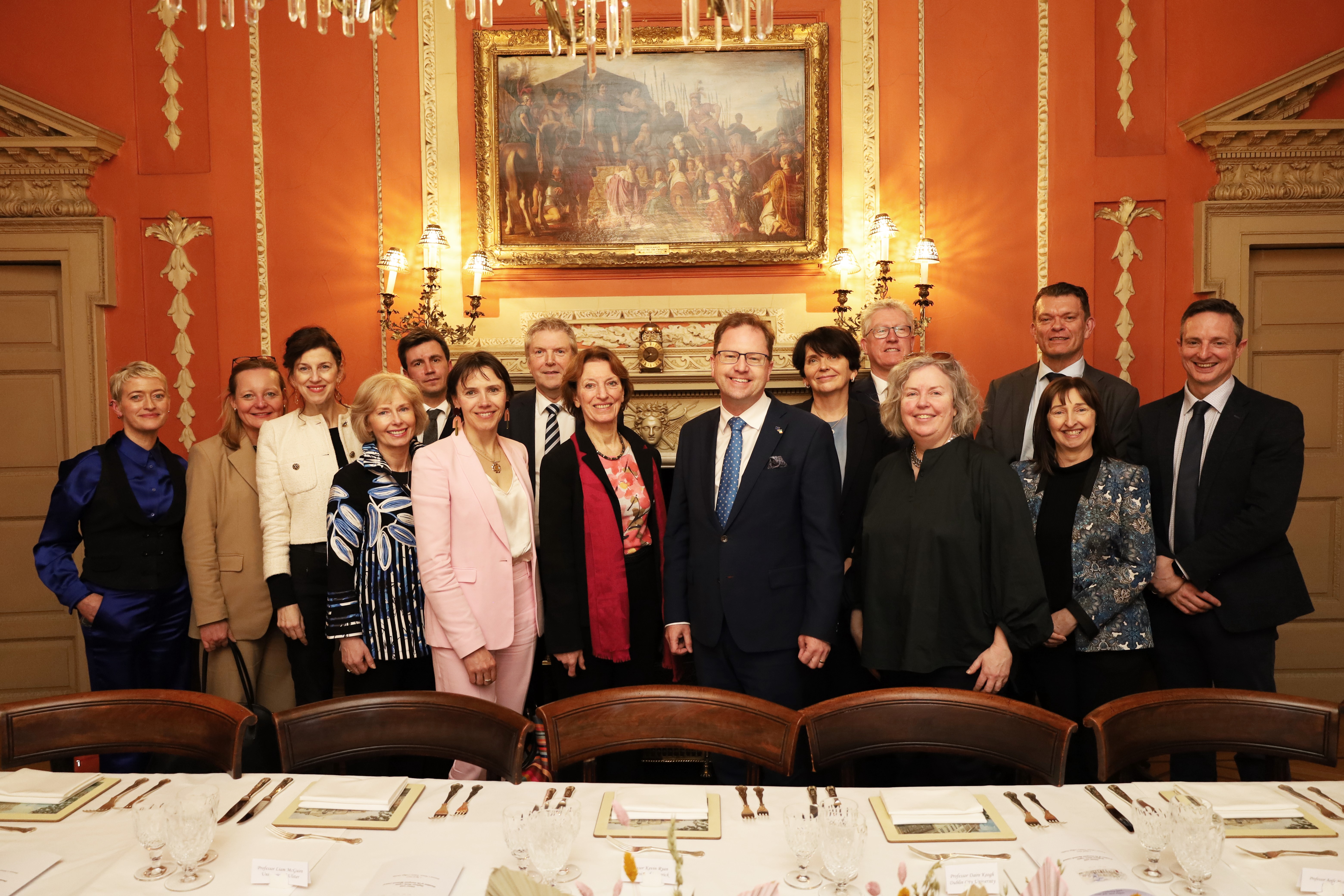 Dinner Reception at the TCD Provost House for ERC President. From L-R: Dr Maria Nash (Research Ireland, ERC NCP), Sabine Simross (ERC, Assistant to the President), Madeleine Drielsma (ERC, Press Adviser to the President), Doris Alexander (TCD, Associate Director for European Engagement), Patrick Lansley (IUA, ERC NCP), Aoife McLysaght, (TCD, Government Science Advisor), Prof Liam Maguire, (Ulster University Pro Vice-Chancellor Research), Prof Maria Leptin (ERC President), Minister James Lawless (Minister for Further and Higher Education, Research, Innovation and Science), Prof Orla Feely (UCD President), Prof Dáire Keogh (DCU President), Dr Linda Doyle (TCD Provst and President), Prof Richard Miles (QUB Provost and Deputy Vice-Chancellor), Prof Sinéad Ryan (TCD Dean of Research), Prof Kevin Ryan (UL Vice President for Research) Photo credit: Sianna Fallon
