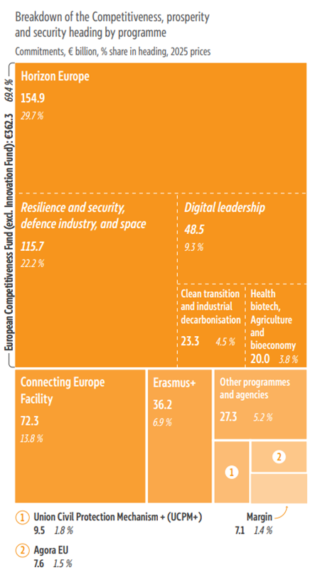 The proposed European Competitiveness Fund (ECF) allocates €115.7 billion to the sub-heading "Resilience and security, defence industry and space". The sub-headings: ‘Digital leadership’, ‘Clean transition and industrial decarbonisation’, and even ‘Health, biotech, agriculture and bioeconomy’, will attract significant defence interest. Military mobility funding under the Connecting Europe Facility will surge tenfold to €17.65b, embedding defence needs into transport and infrastructure planning. There is €9.5b for the Union Civil Protection Mechanism.