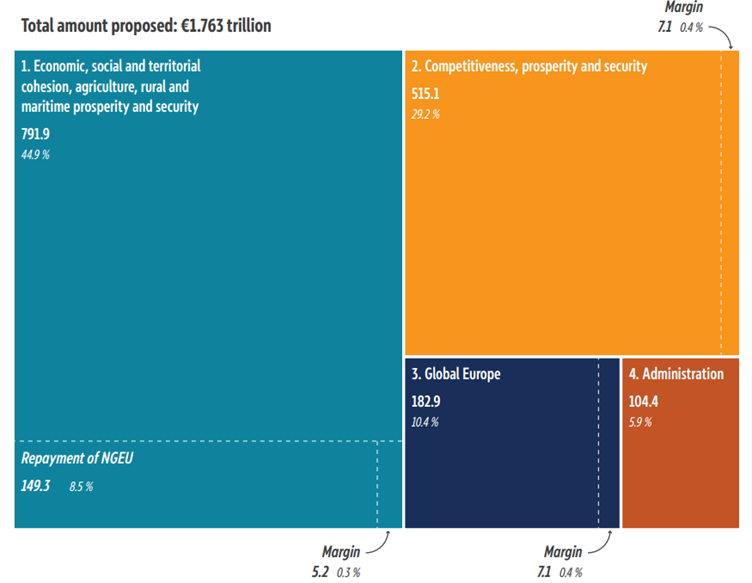 The European Commission’s proposal for the Multiannual Financial Framework (MFF) 2028-2034 signals a profound shift in EU spending priorities. This shift is in reaction to the full-scale invasion of Ukraine by Russia; the hybrid pressure campaign attributed to Russia such as drone incursions, GPS jamming, cable cuts, arson/sabotage at logistics hubs, and cyber operations; and doubts about US commitment to NATO. It reflects substantial defence funding increases across NATO countries.