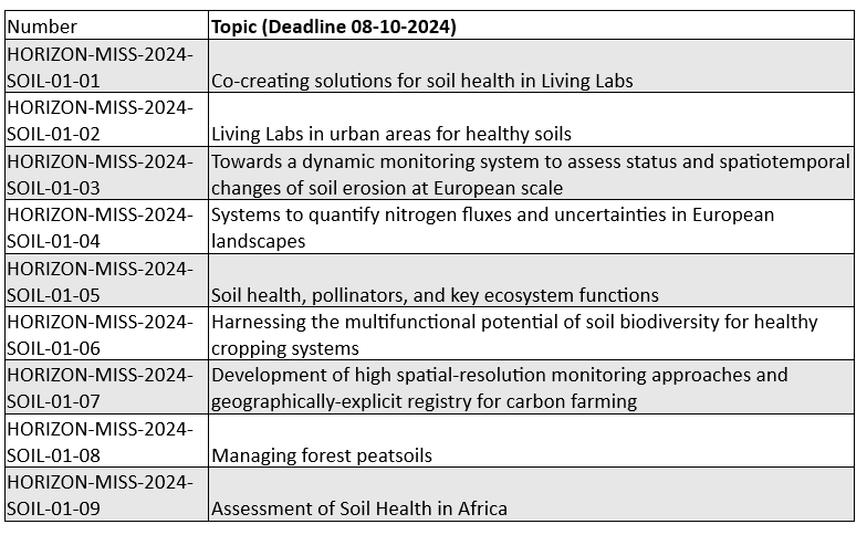 The Work Programme for the Soil Mission Research Calls Can be found here: Calls for proposals | EU Funding & Tenders Portal (europa.eu) and wp-12-missions_horizon-2023-2024_en.pdf (europa.eu)