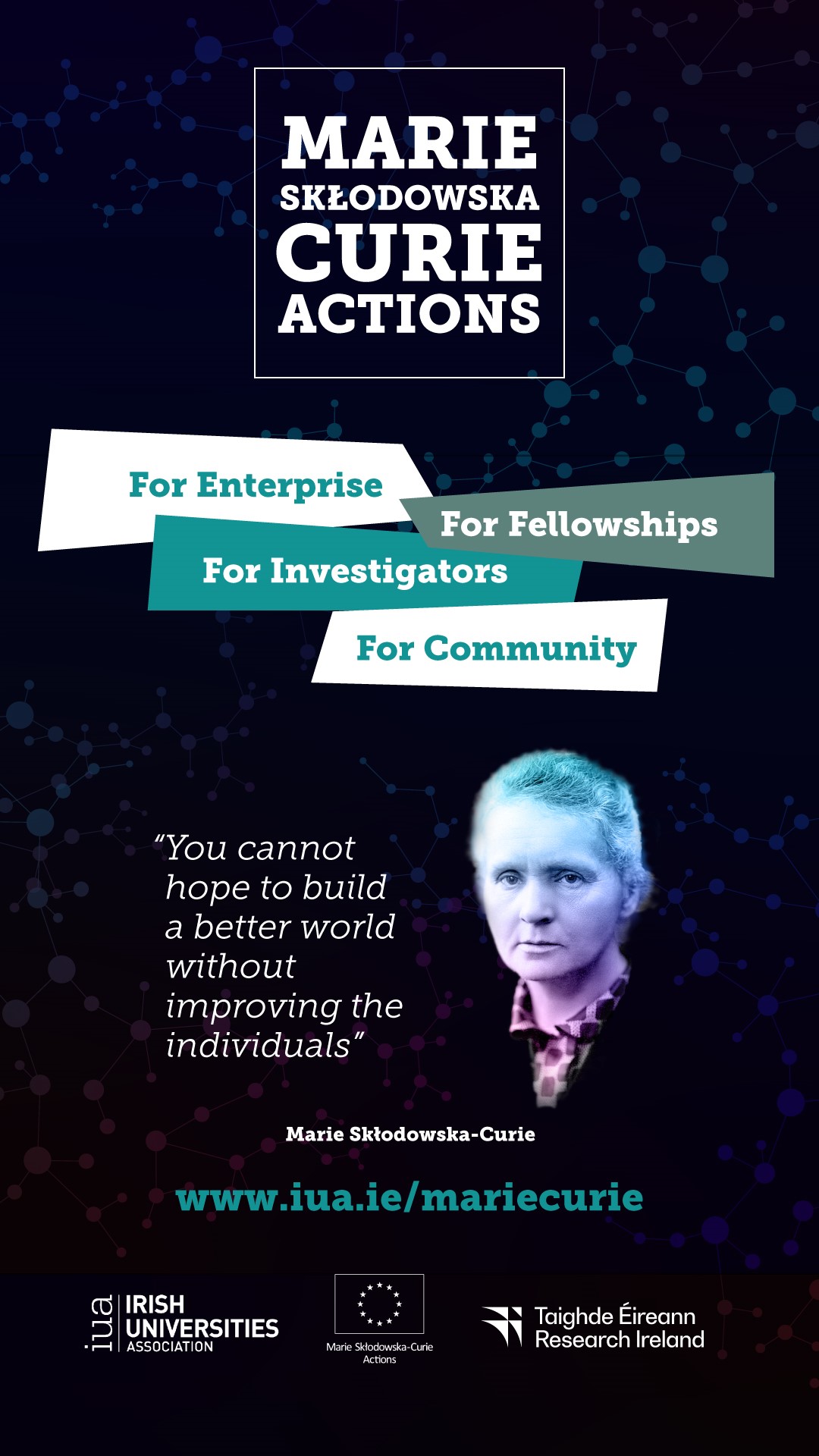 The Irish Marie Skłodowska-Curie Office is based within the Irish Universities Association and operated under a joint partnership with Taighde Éireann – Research Ireland. The Office offers a range of supports to help Ireland-based organisations across all sectors and disciplines to apply for MSCA funding. Our supports include information sessions, tailored consultancy on large proposals coordinated from Ireland, proposal writing handbooks, workshops, a proposal pre-review service, and query support. Interested applicants can contact us ([email protected]) and check our website for more details on the MSCA funding opportunities. You can also follow us on our X and LinkedIn social media channels for key updates.